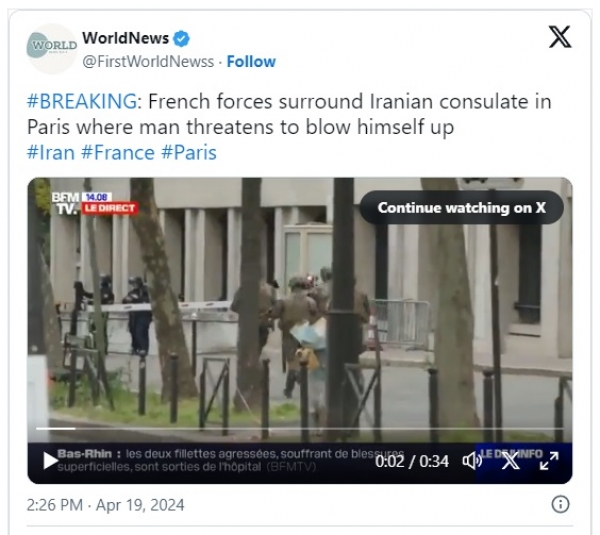 Nepoznati muškarac zaključao se u zgradu iranskog konzulata u Parizu i preti da će se razneti. Oblast je ogradila policija. “U ovom trenutku, muškarac se zaključao u zgradu iranskog konzulata u Parizu i preti da će se razneti”, prenose mediji.