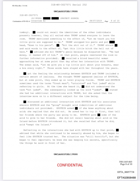 Tijekom razgovora s FBI-jem, žena je također rekla da sada surađuje s odvjetnicima na građanskoj parnici. Također je rekla da su ona ili njezini voljeni primili prijeteće telefonske pozive. Sumnjala je da su od Epsteinove rodbine, ali je također sugerirala da bi Trump mogao biti umiješan.