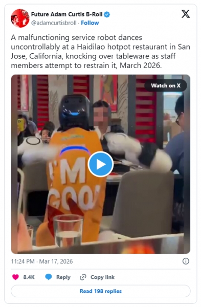 U utorak su gosti restorana Haidilao u San Joseu doživjeli neočekivani poremećaj kada je servisni robot, očito dio interne izvedbe, pokvario i počeo se nepravilno kretati.