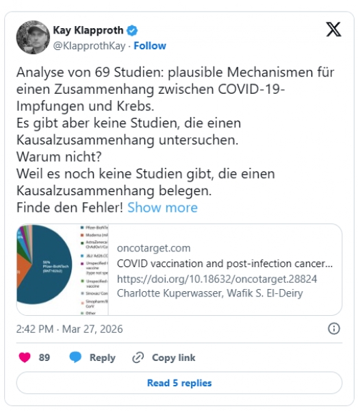 To je ultimativni adut zdravstvenih vlasti i samozvanih provjerivača činjenica: “Ne postoje studije koje istražuju uzročnu vezu između cijepljenja protiv Covida-19 i raka.” Zašto ne, točno? Odgovor je gotovo neusporediv u svojoj logičkoj briljantnosti: “Zato što još ne postoje studije koje dokazuju uzročnu vezu.” Apsurdni kružni argument koji služi samo jednoj svrsi: okrenuti glavu, zataškati stvari i održati narativ o navodno “sigurnom i učinkovitom” cijepljenju pod svaku cijenu.