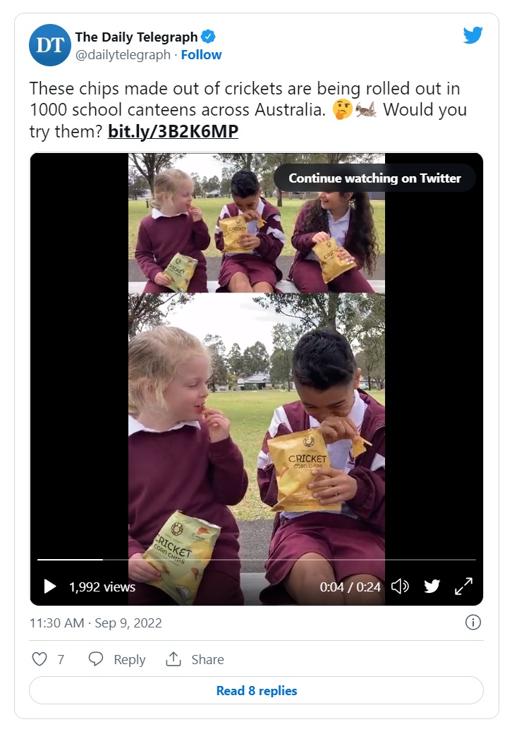 Članak u australskom The Daily Telegraphu skriven iza paywalla trenutno izaziva neviđeni bijes na društvenim mrežama. Prema njemu, 1000 australskih škola već prodaje čips od insekata učenicima kako bi popularizirali i normalizirali ovu vrlo upitnu hranu, a sve to za dobrobit klime. Još više uznemiruje popratni video koji prikazuje kako netko – vjerojatno novinar – pokušava uvjeriti vrlo malu djecu da je ovaj čips posebno zdrav za njih. Studija pokazuje suprotno.
