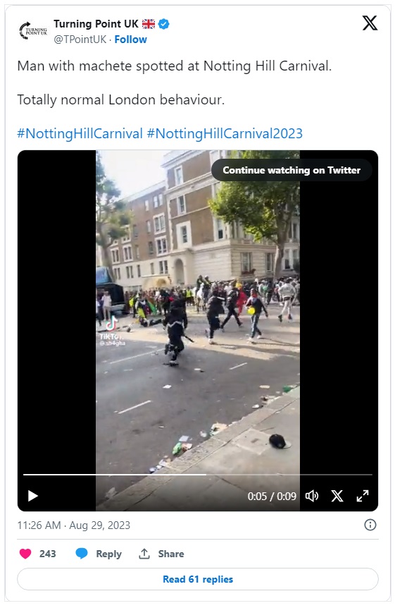 Breitbart izveštava: Dvodnevni afro-karipski karn u Noting Hilu, koji je bio glavna tema leta u okrugu centralnog Londona od 1960-ih, ove godine je imao 275 hapšenja, a osam muškaraca je izbodeno nožem, uključujući 29-godišnjaka koji je je teško povređen nakon što je napadnut u ponedeljak uveče na Vorfild Roudu.