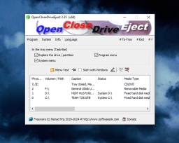 This OpenCloseDriveEject tool was created based on user request, here I have put my stuff into it and equipped it with a few extras. According to personal needs and the ideas of the users of this Windows tool is still extended. Have fun with this nice Windows tool, which will spare you a few simple steps under Windows. With under 300 KB a very small software, which is not wasting space on the hard disk, can be deleted at any time.