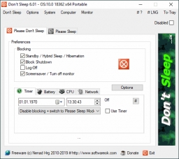 Don't Sleep helps prevent system Shutdown, Standby, Hibernate, Turn Off and Restart operations. This is useful to temporarily disable automatic power-saving tools without modifying any system settings. Works great for running a presentation, defragmenting a disk, or encoding a large file.