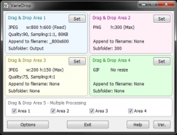 VarieDrop is a unique image resizing tool that allows you to quickly resize images based on four different presets. Each preset is shown as a color coded drop area and you can simply drag'n drop an image onto the area to resize it accordin to the area's settings.