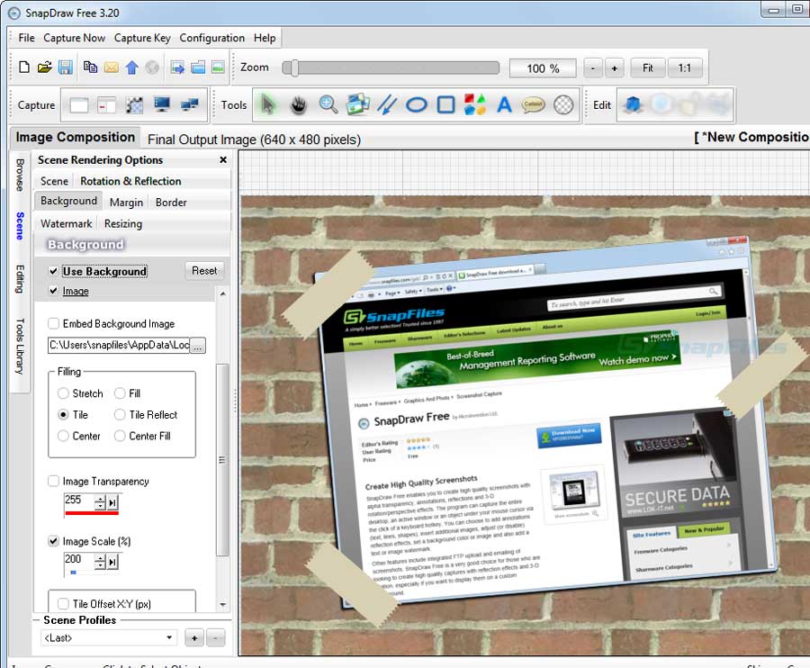 SnapDraw Free is a very good choice for those who are looking to create high quality captures with reflection effects and 3-D rotation, especially if you want to display them on a custom background.