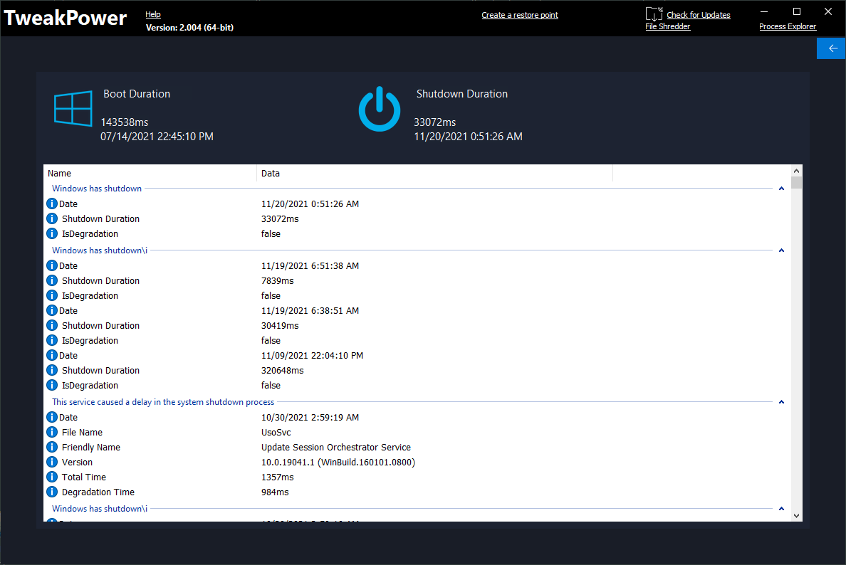 System Maintenance System Maintenance - Autostart programs, Autoplay, and Manage scheduled tasks, uninstall or change uninstaller programs, troubleshoot disk errors, and troubleshoot typical Windows problems. Windows Repair Section (Fix-It-Tools) to fix a large majority of known Windows problems. Data backups - TweakPower saves all optimizations. All changes from TweakPower can be taken back here. Restore points enable you to restore the computer's system files and settings to an earlier state, and to perform a complete backup or restore of the registry.