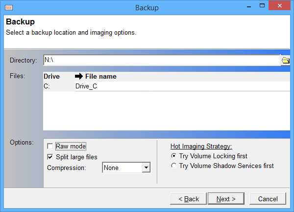 DriveImage XML can use volume locking or Volume Shadow Services (VSS) to create the backup image from within Windows, without the need to reboot. The program stores your images in .dat files, using XML format, allowing you to process them with 3rd party applications.