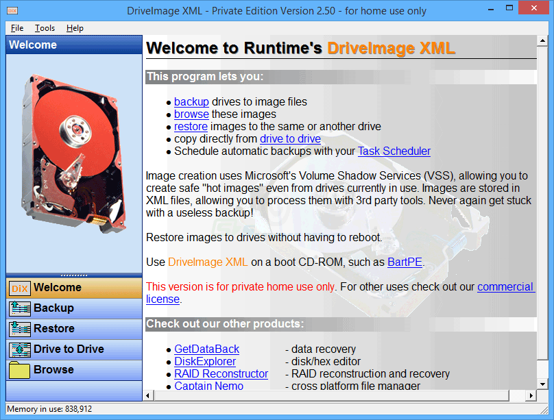 | This is one of the simplest HD/File back-up software to have. You can back-up HD to an image & then browse it, restore an HD to the same one or another, copy HD to HD and schedule it with Windows Task Scheduler. I wish more software would use Windows utilities with their own. It is a good way to create a light program. Also you can use it on a boot CD like BartPE, but you will need to download the plugin from their(DriveImageXML) website. It is very easy to use. I usually use this when I back-up my HD and migrate to a new HD.