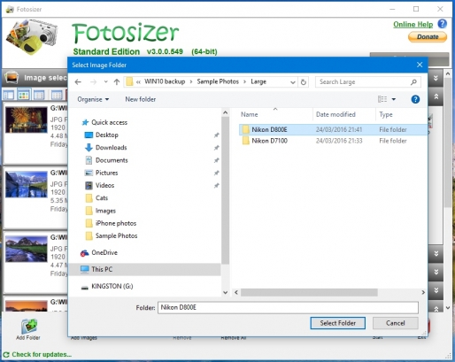 Other features include support for EXIF and XMP data, image rotation, and optional Black&;White or Sepia effects. Fotosizer supports JPG, PNG, TIFF, GIF, BMP and TGA image formats.