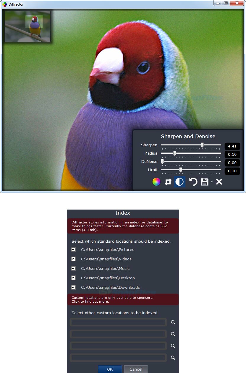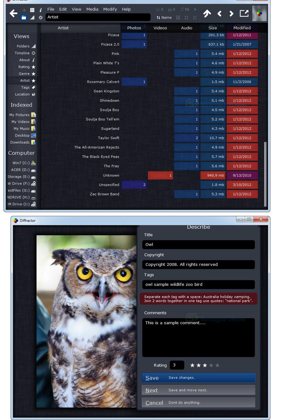 Diffractor enables you to view, find and organize your photo, images and audio files. The program indexes you media files and allows you to browse them by rating, genre, tag, camera model, location and other details. You can also perform various image editing functions, including crop, rotate, sharpening and color adjustments.