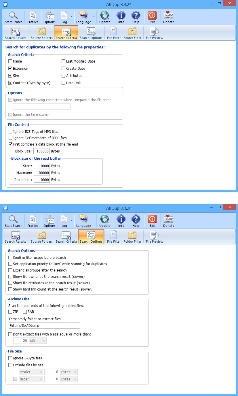 AllDup enables you to find duplicate files across one or more folders or drives. You can choose to match files by size, name, date, attributes and byte-by-byte content comparison. You can also configure a variety of settings to exclude certain file types or folders from the search. AllDup will then scan the selected folders and produce a list of all duplicate files that were found.