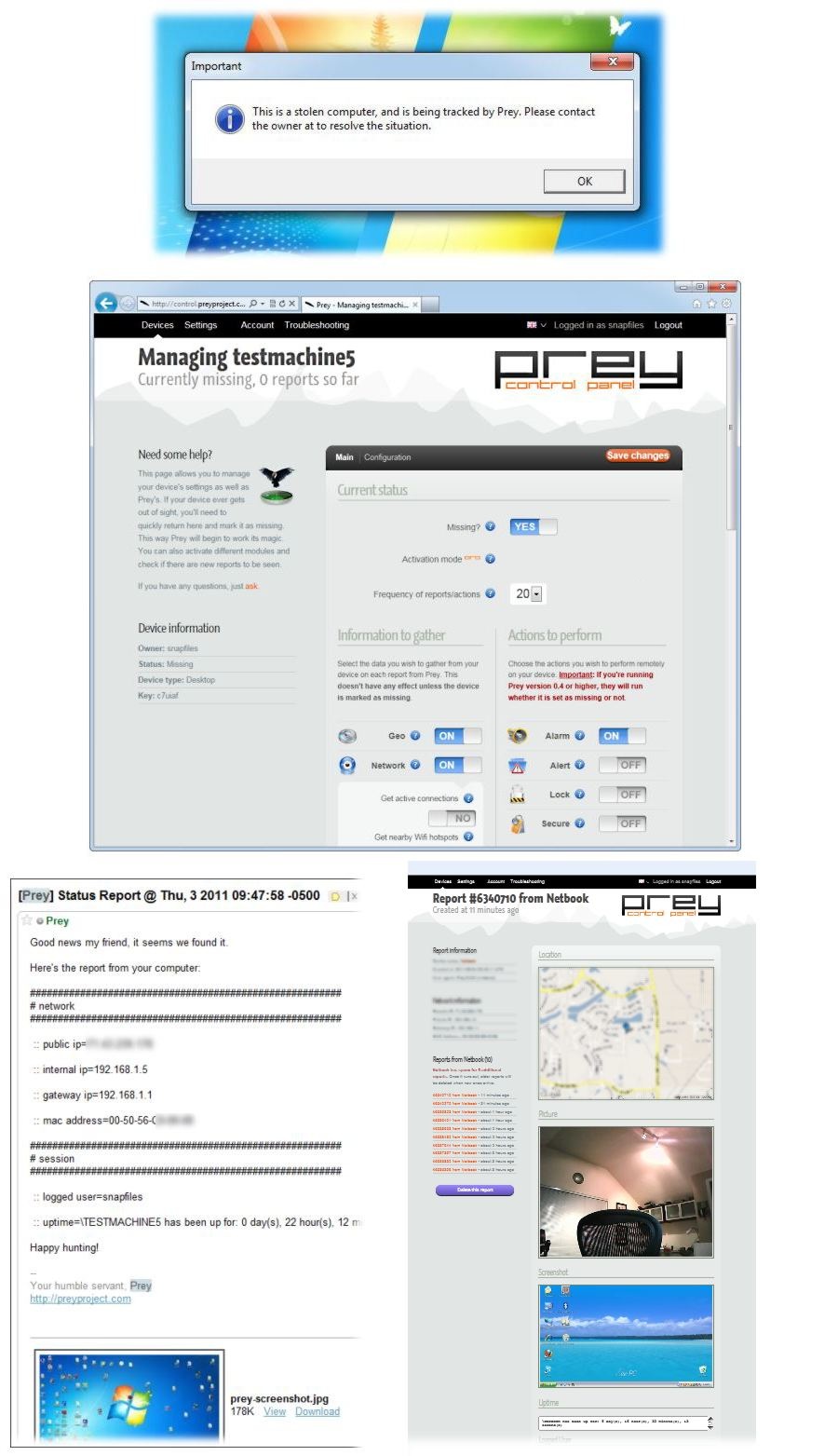 The program basically runs as a local server on your system that interacts with an online website, which it frequently checks for a "signal" that will cause Prey to start uploading its geographical location (via GPS or nearby WiFi spots), IP address, network information, a screenshot of the desktop, and more.