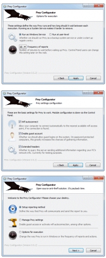 Prey can be used with an online control panel at Preyproject.com or, if you are an advanced user, you can use your own web server and receive reports via email. In case your laptop is stolen or lost, you can activate the signal from the control panel or, if using your own server, delete a special HTML file on your server to cause Prey to start sending reports.