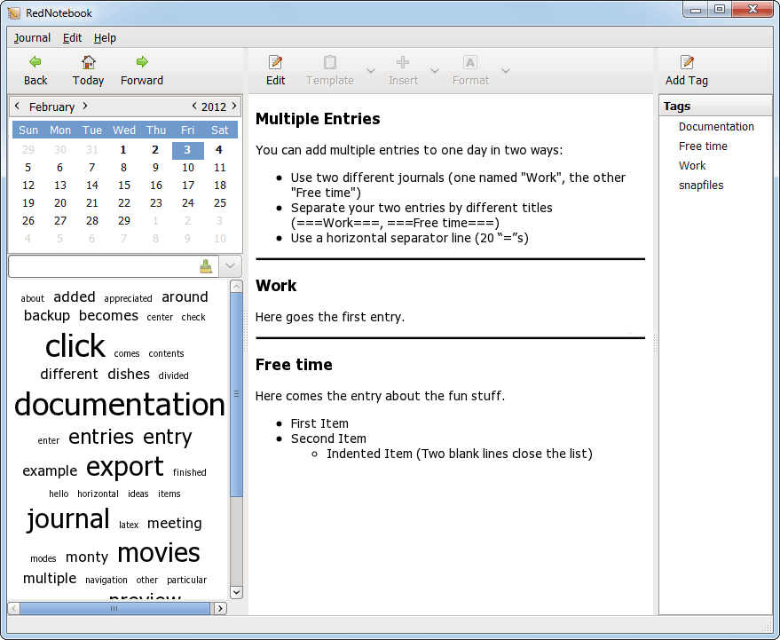 Other features include export to PDF, Text, HTML and Latex, integrated backup to ZIP archive. Your journal are saved in plain text format, so you can use them at any time without depending on RedNotebook