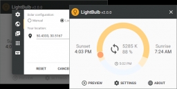 Its primary objective is to match the color of the screen to the light sources of your surrounding environment - typically, sunlight during the day and artificial light during the night. LightBulb has minimal impact on performance and offers many customization options.