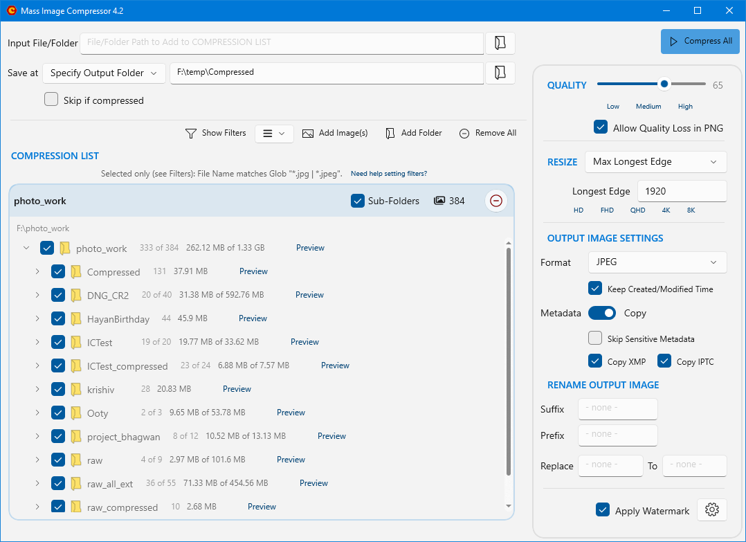 Mass Image Compression for webpages, email or storage on mobile device was never this easy. Supports a wide range of image formats including JPEG, BMP, WMF, TIFF, PNG. Compressed images will be in either JEPG or PNG based on your selection. Version 3.1.0.1 brings support RAW formats of most cameras, filter based on image size, improved resizing and compression algorithms, saves progressive JPEG for faster page load and higher page rank.