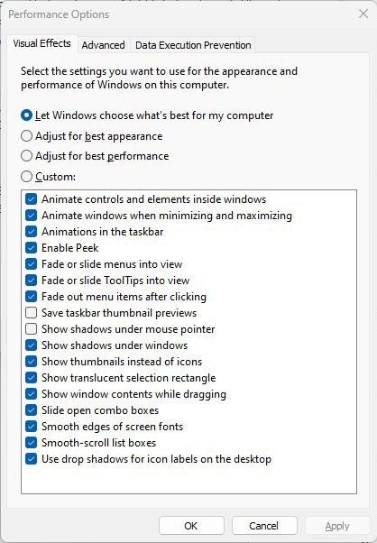 The Performance Options dialog box lets you turn off visual effects that might be slowing down Windows 11.