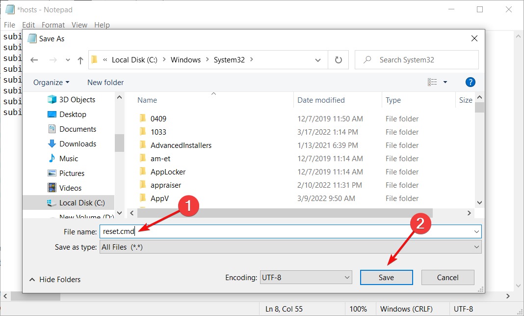 Click File from the menu, select Save As, and then name the file reset.cmd.