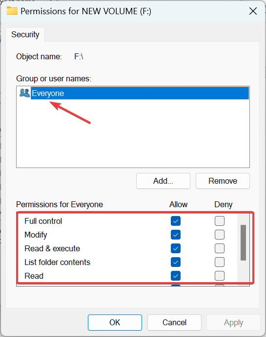 Enter Everyone in the text field, click on Check names, and then on OK on all windows to save the changes.