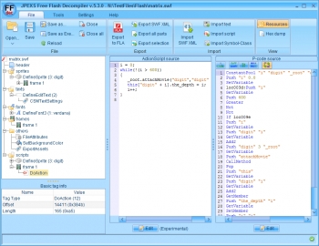 JPEXS Free Flash Decompiler enables you to decompile and edit the content of SWF Flash files, including .swf, .gfx and .swc. You can view and extract resources (shapes, sprites, fonts, buttons...), convert ..