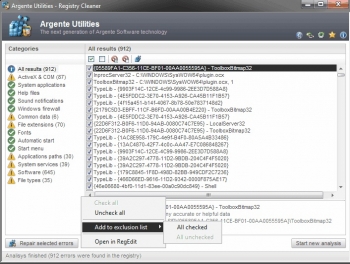 Argente Registry Cleaner is an utility that uses a high-performance detection algorithm to quickly identify missing and invalid references in the registry (problems related with shortcuts, ActiveX, system ..