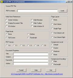 Tweak PDF lets you set the initial view preferences of a PDF document, such as whether to center window of the PDF file when opened, whether to display document title, to fit window, to hide menu bar, to hide toolbar, and to hide window UI. You can also set the page mode of a PDF document, such as show PDF files in full screen mode, outlines mode, thumbnail mode, or simply without any special mode. In addition, PDF document properties such as title, subject, author, keywords etc. can be modified.