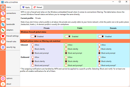 Windows Firewall Notifier extends the default Windows embedded firewall behavior, allowing it to handle real time connections monitoring, connections map, bandwidth usage monitoring.
