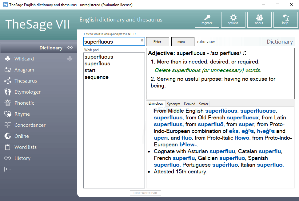 TheSage is a complete dictionary and a multifaceted thesaurus of the English language. It runs locally, and does not use your Internet connection. The program offers a unique structured display, as well as wildcard search, anagram search and more.