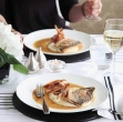 Gos narežemo in ponudimo z omako in ohrovtom, ki smo ga na hitro pregreli na maslu.