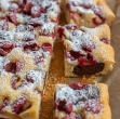 Vlijemoč v pekač, poravnamo in posujemo z višnjami, Ki jih rahlo potisnemo v testo.