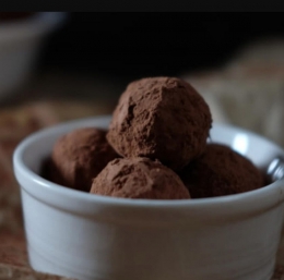 Z dvema žličkama iz mase oblikujemo manjše kroglice. Povaljamo jih v kakavu, zložimo na krožnik in damo v hladilnik, da se učvrstijo.