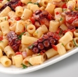 1 hobotnico, težko okoli 2 kg 40 dag majhnih okroglih testenin 1 čebulo 2 stroka česna 3 večje paradižnike 1,5 dl olivnega olja list lovorja, kos cimeta v celem sol, poper