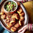sok 1 limone 150 g navadnega jogurta 4 stroki česna za palec velik kos ingverja 1–2 zelena čilija (glede na to, kako pekoče nam je všeč) majhen šopek koriandra ½ žličke kurkume 1 žlička mletega kumina (orientalske kumine) 1 žlička garam masale 1 žlička soli 16 piščančjih stegen brez kože in kosti 1 velik krompir za peko, po dolgem razpolovljen 6 kruhkov naan ali pita 1 limona, narezana na krhlje, ko postrežemo