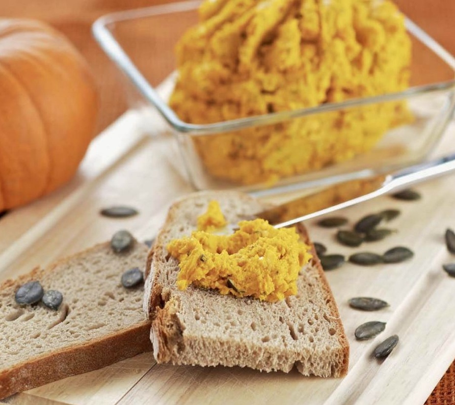 Bučni namaz s pistacijami odlično tekne s črnim kruhom, francosko štruco ali toastom.