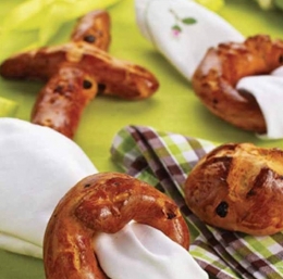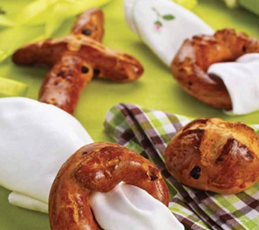 Testo razdelimo na pomokani delovni površini na kupčke in iz njih oblikujemo poljubne okraske: mini pinco, križ in obroček za serviete. Zložimo jih na pekač, nekoliko sploščimo, namažemo s stepenim rumenjakom in na kratko pustimo še vzhajati. Pečemo v prej ogreti pečici pri 180 °C 10 do 15 minut.