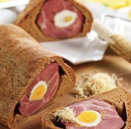 Z dolgim ostrim nožem po sredini kosa prekajenega mesa vzdolžno križno zarežemo. Zarezo nekoliko razširimo in v nastalo odprtino vstavimo cela kuhana jajca in nariban hren.