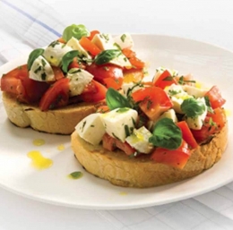 Rezine kruha opečemo, jih podrgnemo s česnom in nato obložimo z mocarelo in kockicami paradižnika. Posolimo, potresemo z baziliko in po želji s pekočim feferonom. Na koncu pokapljamo z oljčnim oljem in takoj postrežemo.