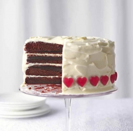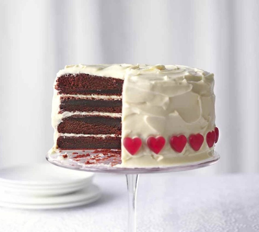 V skledi na hitro stepemo kremni sir in maslo, nato v zmes dobro vtepemo sladkor v prahu in vaniljevo aromo. Z malo kreme sestavimo vse štiri ohlajene testene oblate, s preostalo kremo pa vrtinčasto namažemo celotno torto in jo okrasimo s srčastimi žele bomboni. Za nekaj časa jo postavimo na hladno (vendar ne v hladilnik), da se malo učvrsti, preden jo postrežemo.
