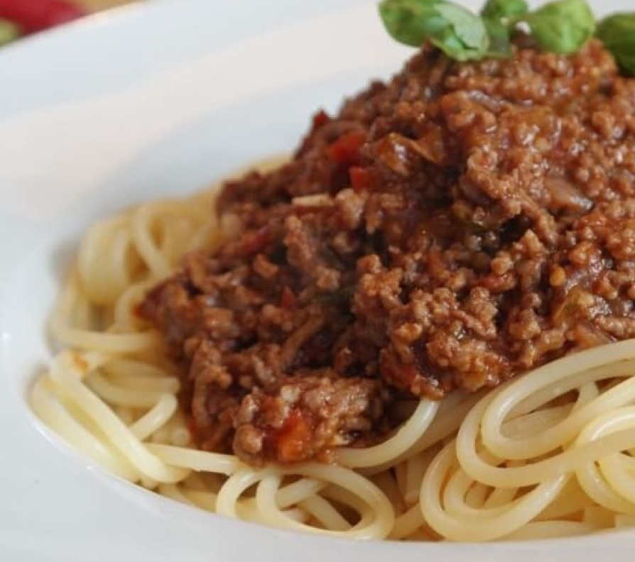 Na prepraženo čebulo položimo meso, dobro premešamo in ga z leseno lopatko med praženjem razdrobimo, da ni večjih kep. Po približno 10 minutah, ko je meso že lepo rjavo, dodamo sesekljan česen, premešamo in počakamo, da zadiši, nato dodamo sesekljane pelate, paradižnikovo mezgo in peteršilj. Solimo in popramo. Kuhamo še 15 minut, da se omaka zgosti.