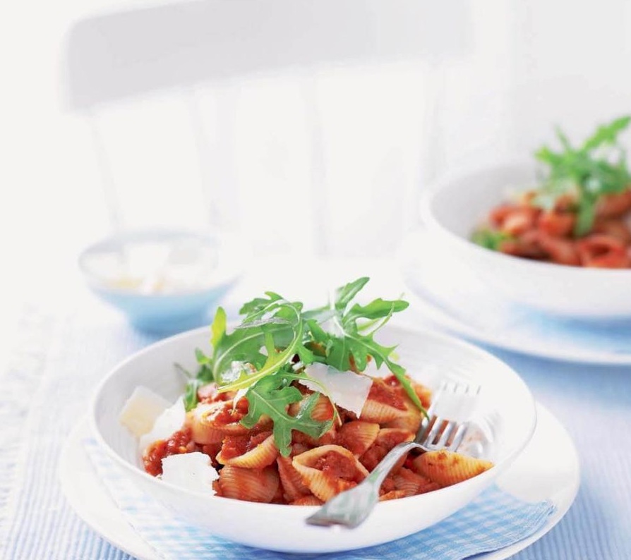 1 žlica oljčnega olja 1 velika čebula 2 stebla zelene 2 korenčka 1 por 2 papriki 2 pločevinki (po 400 g) paradižnika (pelatov) 4 stroki česna 1 žlica sladkorja 1 žlica balzamičnega kisa 300 g testenin (školjke) sol poper sveže nariban parmezan in po želji rukola za posip