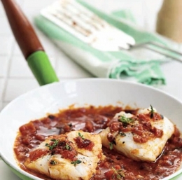 Ogenj zmanjšamo in omako kuhljamo 5 minut, nato ji dodamo še ribje fileje. Ponev pokrijemo in kuhljamo še 8 do 10 minut, da se riba do konca skuha. Postrežemo s pečenim ali v sopari kuhanim krompirjem.
