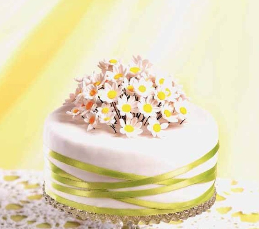 Cvetlice naredimo tako, da malo sladkorne mase tanko razvaljamo in z modelčkom izrežemo marjetice. Vzamemo še malo mase in jo pobarvamo z rumeno jedilno barvo. Iz nje oblikujemo kroglice, ki jih ploščato pritiskamo na fino cedilo, da dobimo mrežast vzorec. Preostalo maso do nadaljnje uporabe zavijemo v folijo, da se ne izsuši.