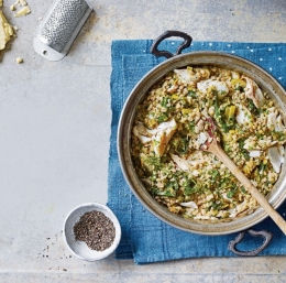 Ribi odstranimo morebitno kožo in jo malo razkosamo. Dodamo jo v ričoto, nato pa še špinačo in peteršilj. Previdno premešamo, da ribe ne zdrobimo preveč. Po potrebi še solimo in popramo. Po želji vmešamo smetano in spet pokusimo, če je dovolj začinjeno. Po želji posujemo z naribanim sirom in postrežemo.