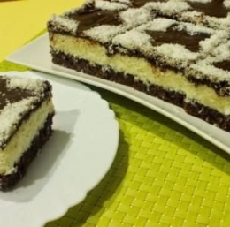 Pekač obložimo s papirjem za peko in vanj vlijemo polovico testa. V ogreti pečici ga pečemo 6 minut. Pekač s testom nato vzamemo iz pečice in po testu razporedimo kokosovo kremo, na katero nanesemo preostanek testa. Pecivo pečemo v ogreti pečici še 7 minut.
