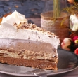 Z mlekom pripravite mešanico za kremšnite po navodilih, da dobite mehko kremo. V ločeni posodi stepite sladko smetano, nato jo v 2–3 korakih vmešajte v pripravljeno kremo. Stopite obe vrsti čokolade. Prvi del: v kremo dodajte mlete lešnike in zdrobljene napolitanke.