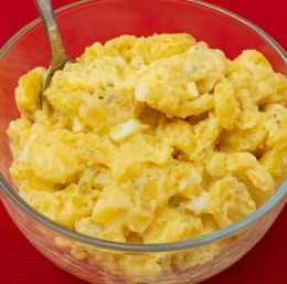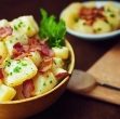 Namesto močne kislosti in pikantnosti čebule boste v tej solati okusili naravno sladkost krompirja, ki se čudovito ujema z nežno omako.