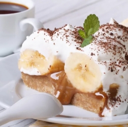 Piškote razporedite po pekaču in jih prelijte z vročim mlekom. Počakajte, da tekočino vpijejo. Banane medtem narežite na kolobarje in jih obložite po piškotih. Pripravite stepeno smetano, kot piše na vrečki, in jo premažite po bananah.
