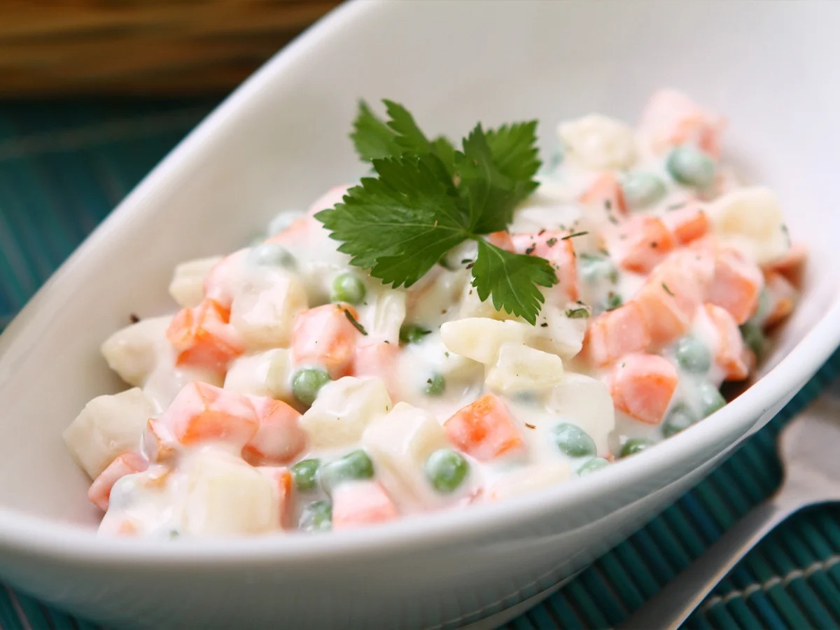2 velika krompirja, narezana na kocke 1 skodelica korenja, narezanega na kocke 1 skodelica graha 1 skodelica kumaric, narezanih na kocke 3 trdo kuhana jajca, narezana na kocke 1/3 skodelice kisle smetane 1/3 skodelice majoneze 1 žlica jabolčnega kisa ali limoninega soka sol in poper