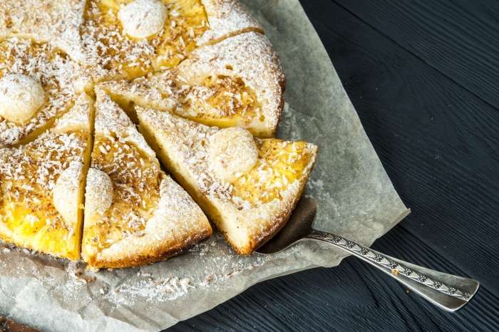 300 ml mleka, 70 g sladkorja, 50 g moke, 50 g masla, 3 rumenjaki, 1 jajce, žlička pecilnega praška, žlička vaniljeve arome, 1 kozarec vloženega ananasa, ščepec soli, sladkor za posip.